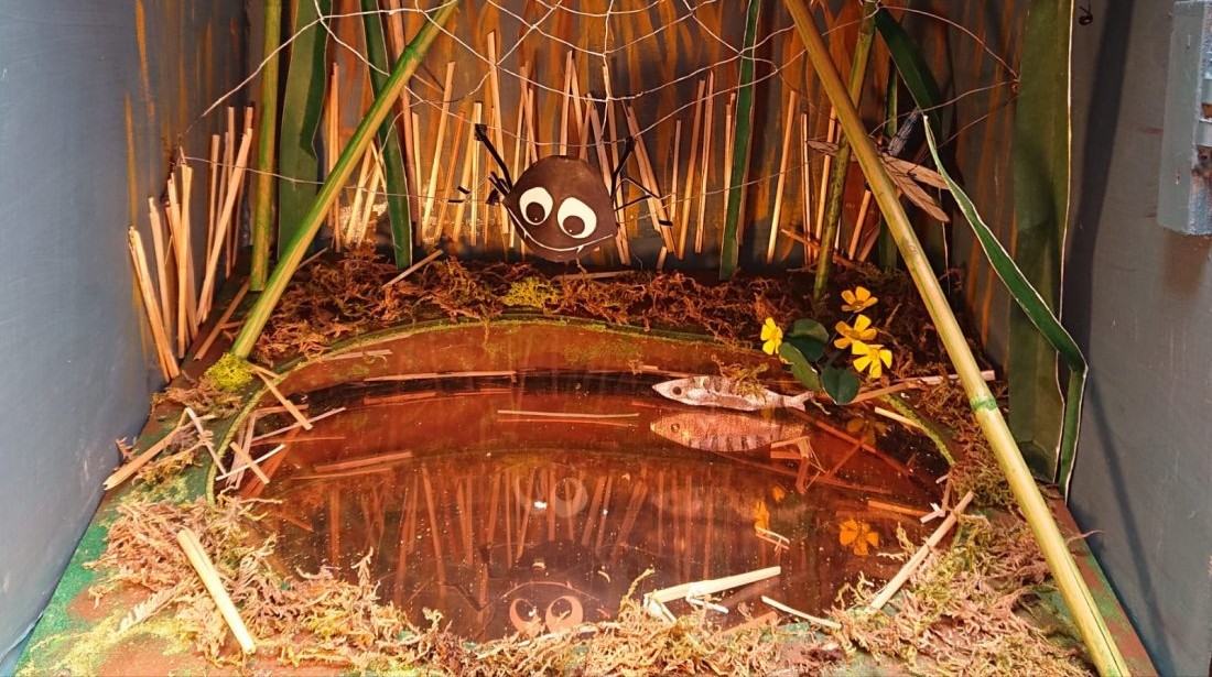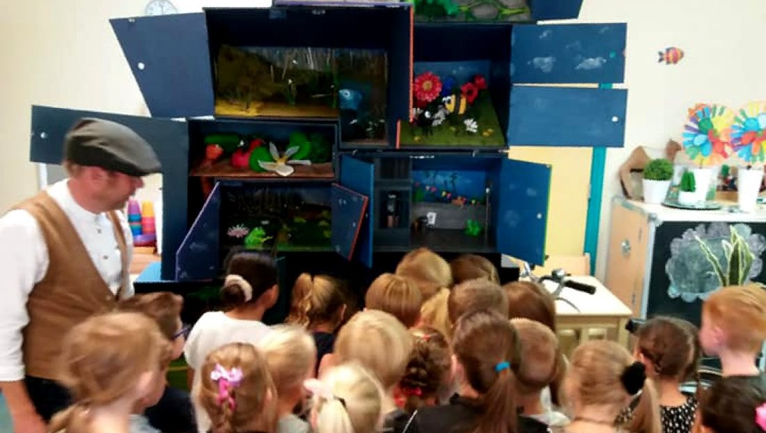 En zo begint de voorstelling die gespeeld wordt voor een kast met 12 vakken, waarin prachtige 3 dimensionale illustraties het decor voor het verhaal zijn. Het avontuur waarin Sanseveria op pad gaat en aan de andere dieren die ze tegenkom vraagt ‘ zie jij wat aan mijn kont?”